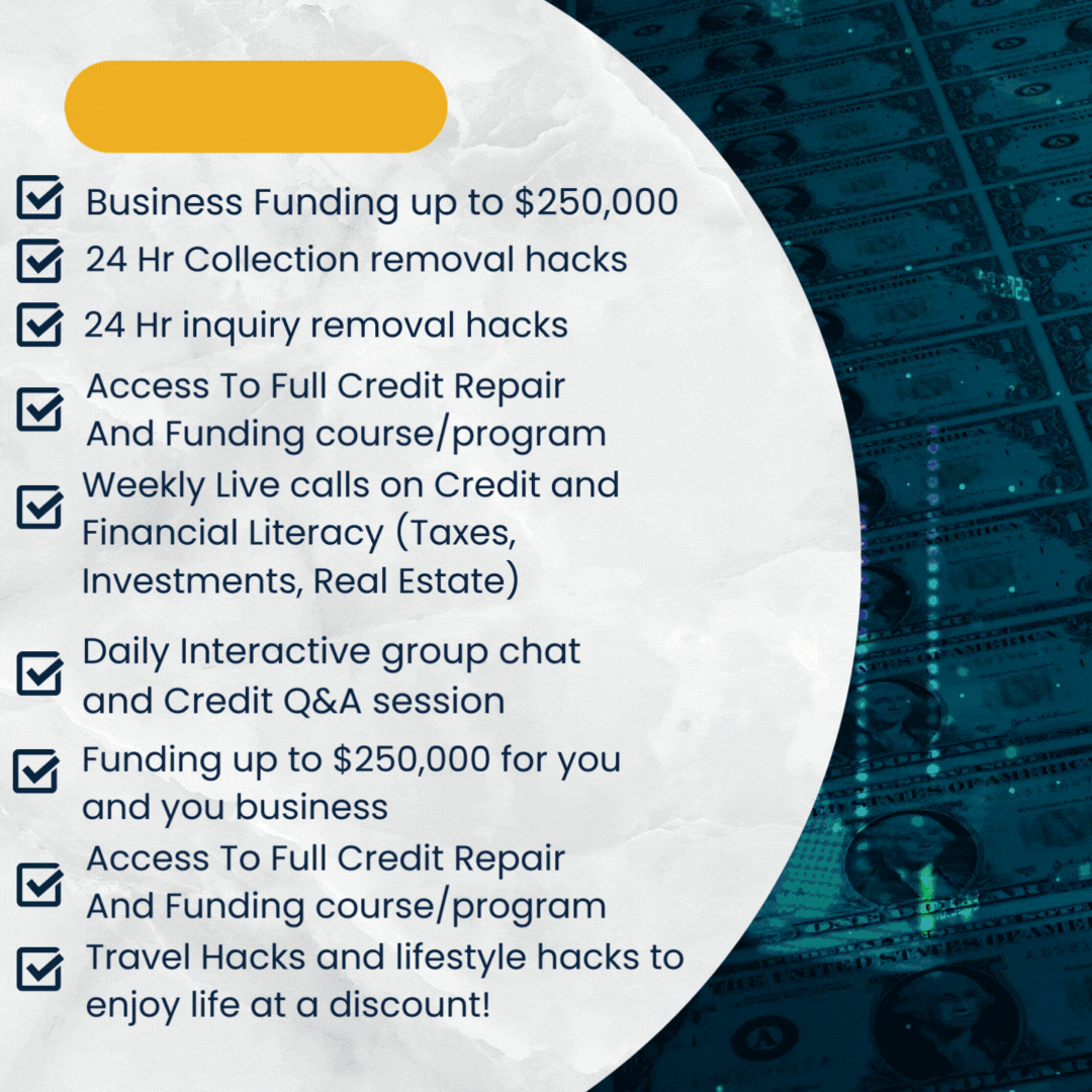 The Credit Literacy course includes a step by step guideline to repairing and building your credit report from scratch! We give you the tools and hacks to remove collections, chargeoffs, repossessions, late payments, inquiries, and more! You also get access to a step by step funding blue print that will help you secure money from the banks. Lastly, you get travel hacks as well as ways you can use all of these strategies to earn an income!